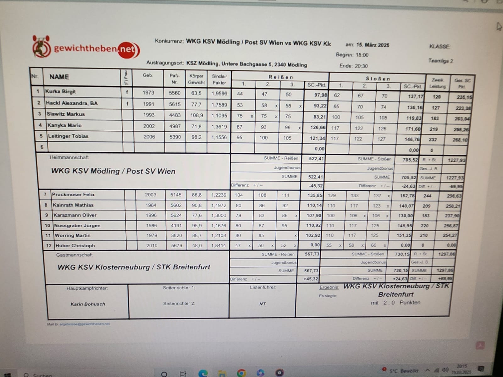 Im Reißen erziehlte das Team aus Mödling 522,41 Sinclairpunkte, konnte sich jedoch nicht gegen die starke Konkurrenz (567,73 Punkten) durchsetzen. Auch im Stoßen reichte die Leistung von 705,52 Punkten nicht aus, um die Gäste (730,15 Punkte) zu übertrumpfen.