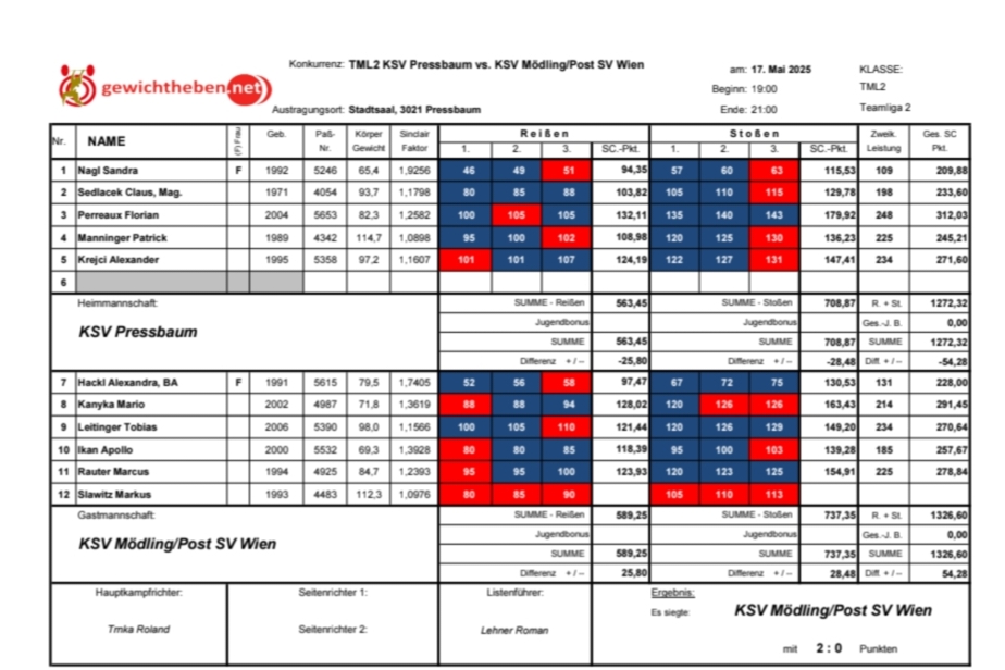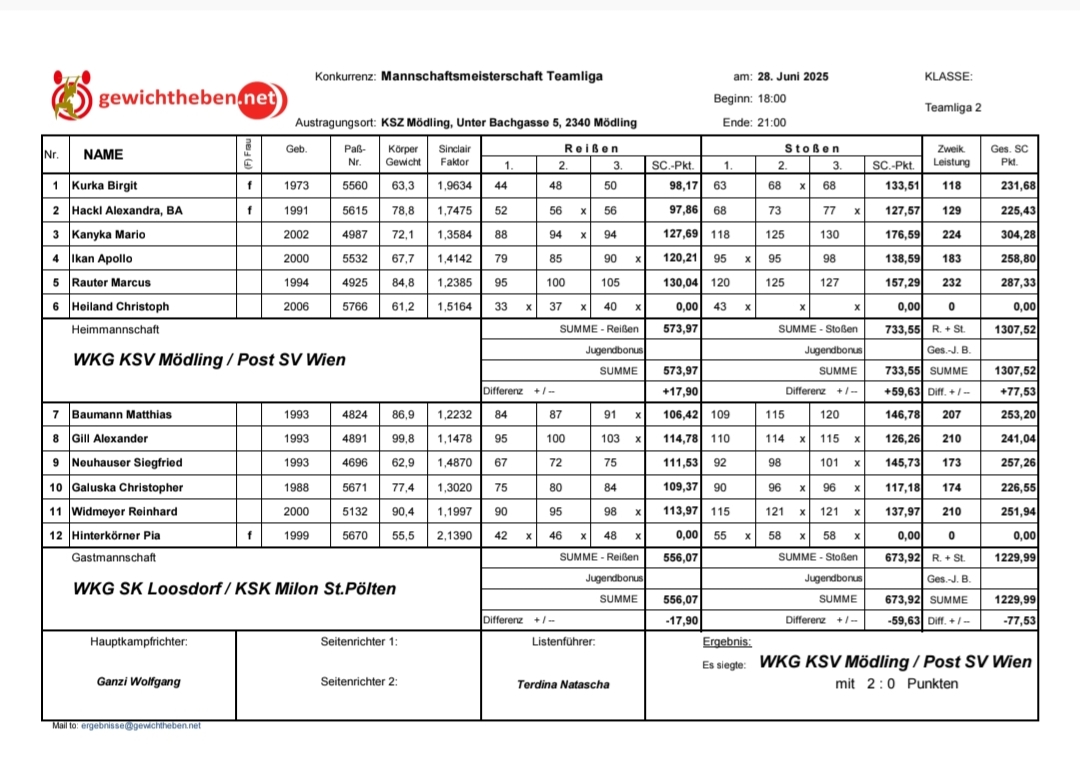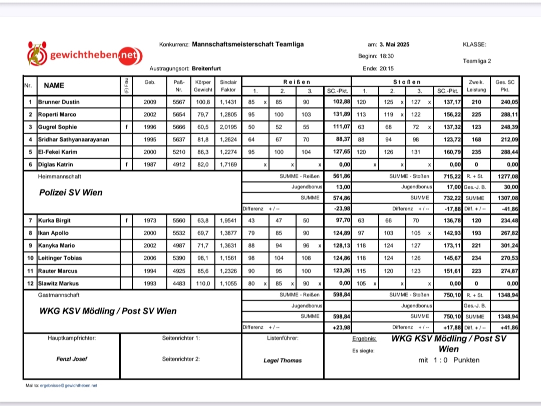 Bei spannenden Mannschaftsduell der Teamliga 2 am 3. Mai 2025 traf die WKG KSV Mödling/ Post SV Wien auswärts auf dem Polizei SV Wien – und lieferte eine starke Teamleistung ab. Mit einem knappen, aber souveränen Vorsprung von 41,86 Sinclair-Punkten (Gesamt: 1.348,94 SC-Punkte) sicherte sich Mödling den 1:0 in einem technisch hochwertigen Wettkampf.