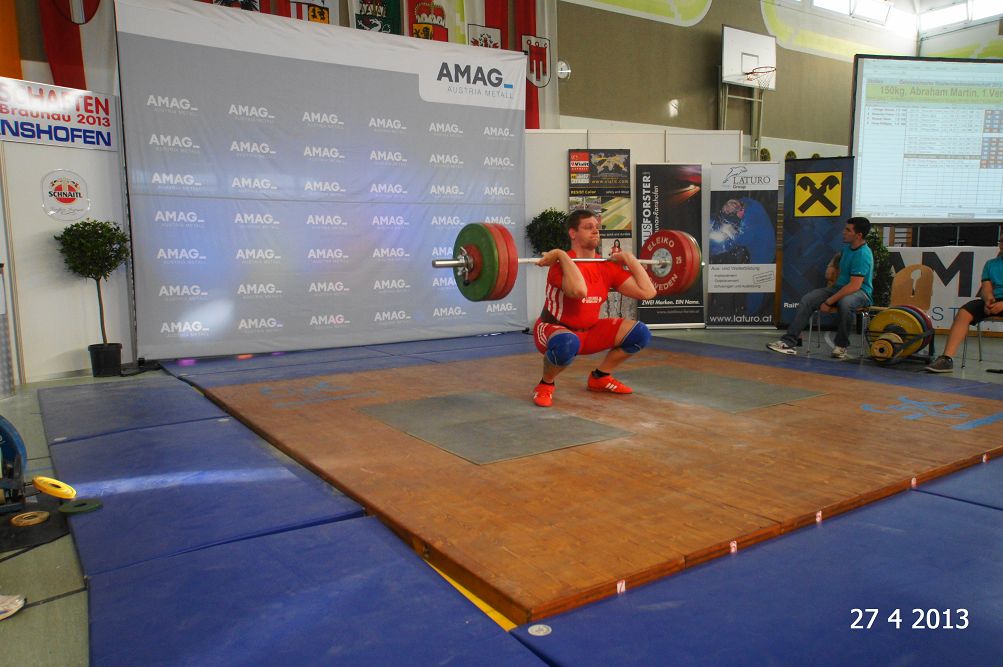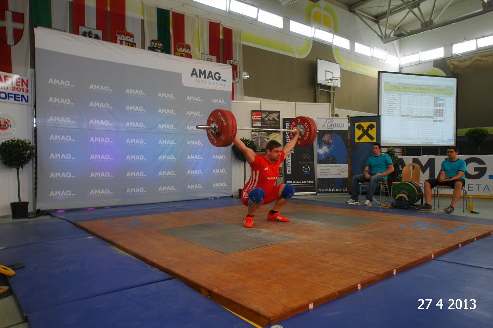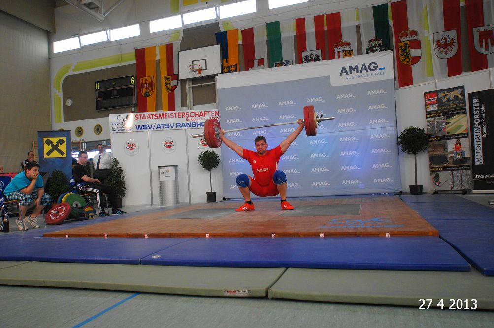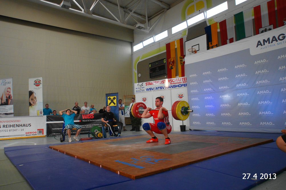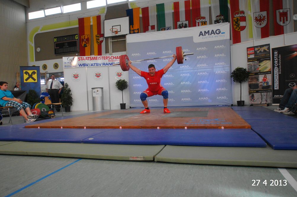 Am Samstag den 27.04.2013 fand in Braunau die Staatsmeisterschaft der Frauen & Männer statt. Mödling hatte nur einen Starter nach Braunau geschickt. Abraham Martin war gut vorbereitet und hatte auch das Glück auf seiner Seite, denn sein schärfster Rivale Dunay Wolfgang hatte 3 Fehlversuche und machte Platz für unseren Löwen in der König s Klasse Plus 105 kg. Martin schaffte 135kg Reißen und 157kg Stoßen --292kg Zweikampf. Gold im Reißen--Silber im Stoßen--Gold im Zweikampf besser hätte es nicht laufen können. Der KSV Mödling gratuliert ihm recht herzlich und wir sind Stolz so einen Spitzenheber bei uns zu haben!