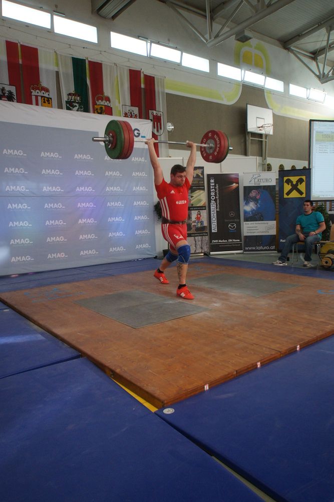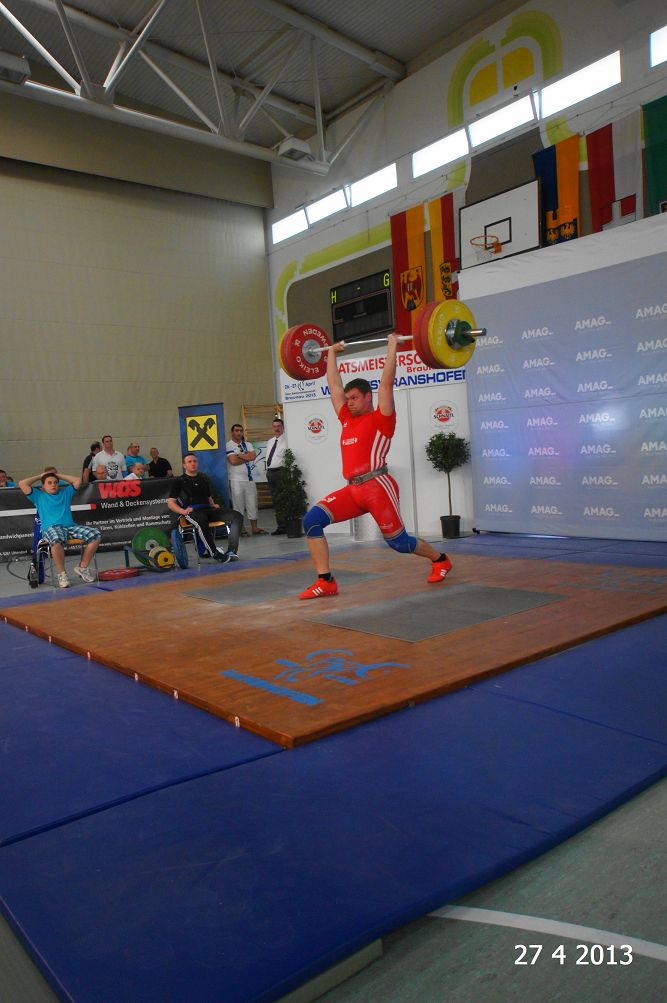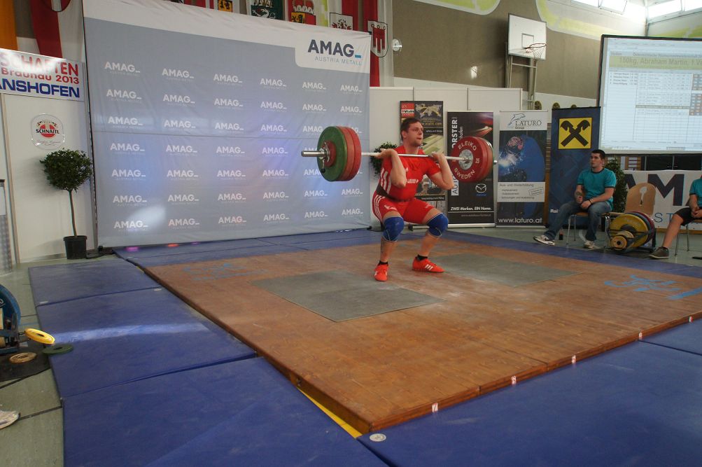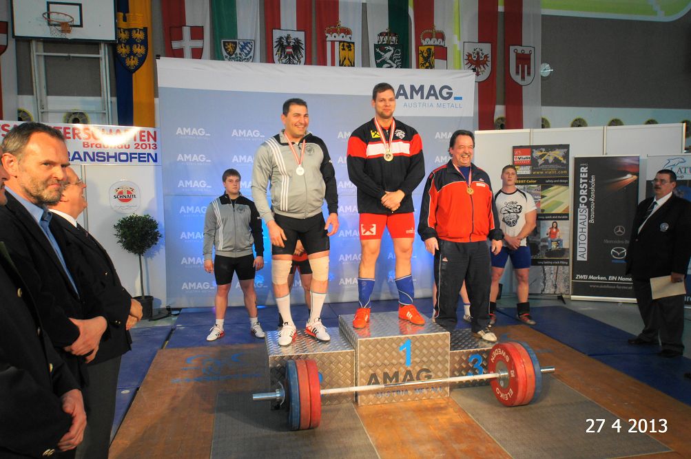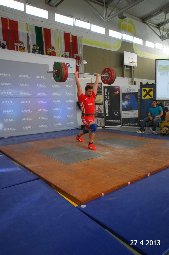 Am Samstag den 27.04.2013 fand in Braunau die Staatsmeisterschaft der Frauen & Männer statt. Mödling hatte nur einen Starter nach Braunau geschickt. Abraham Martin war gut vorbereitet und hatte auch das Glück auf seiner Seite, denn sein schärfster Rivale Dunay Wolfgang hatte 3 Fehlversuche und machte Platz für unseren Löwen in der König s Klasse Plus 105 kg. Martin schaffte 135kg Reißen und 157kg Stoßen --292kg Zweikampf. Gold im Reißen--Silber im Stoßen--Gold im Zweikampf besser hätte es nicht laufen können. Der KSV Mödling gratuliert ihm recht herzlich und wir sind Stolz so einen Spitzenheber bei uns zu haben!
