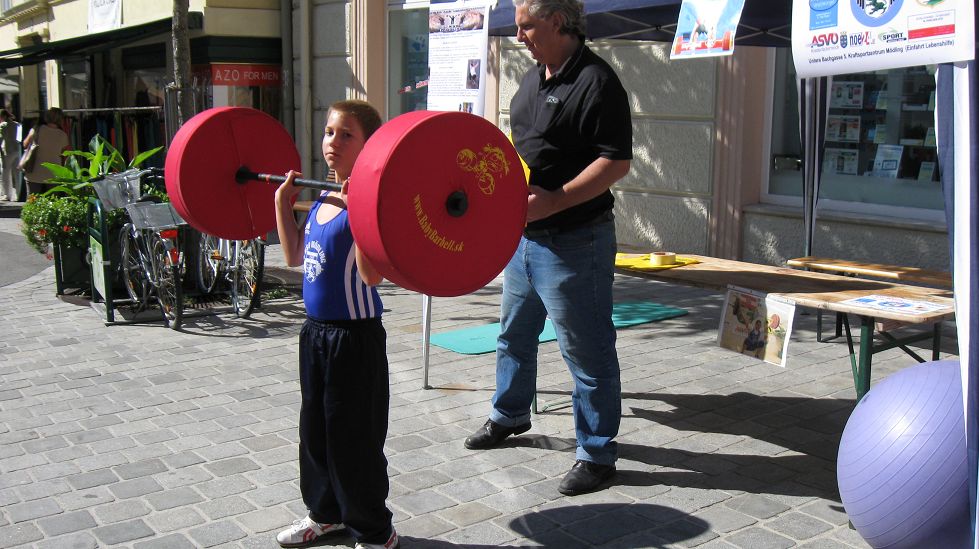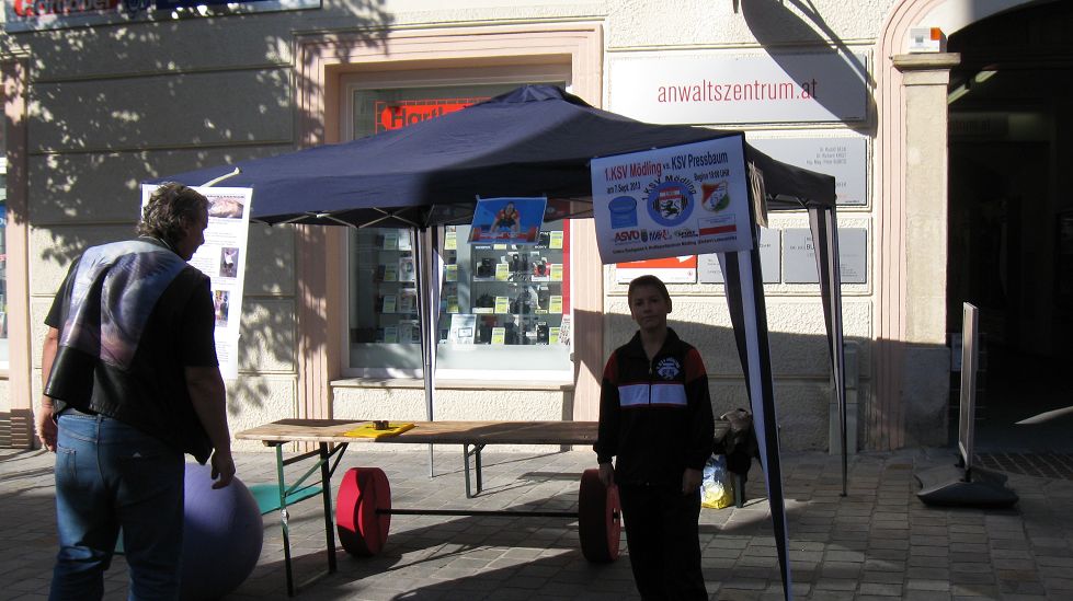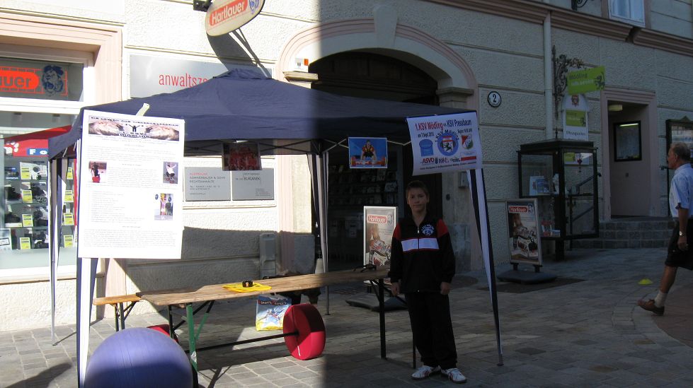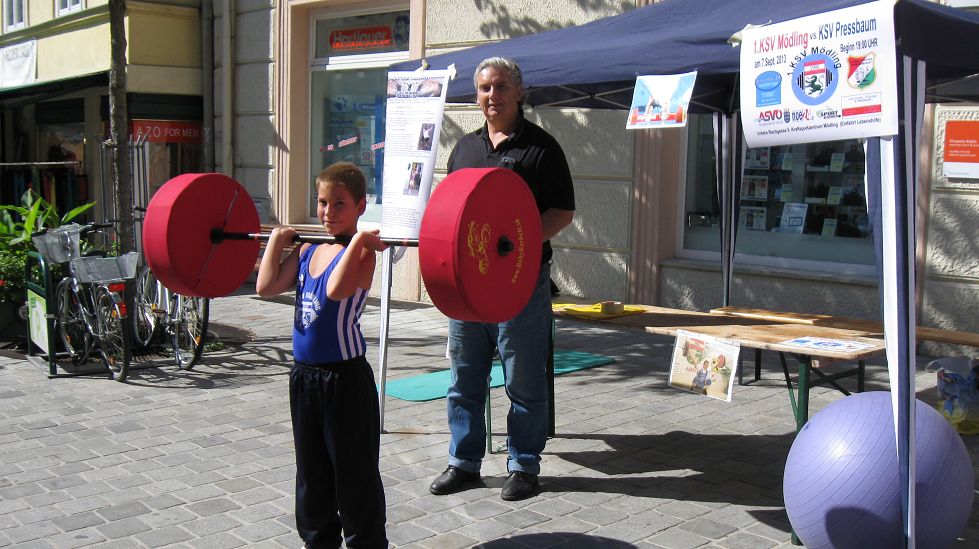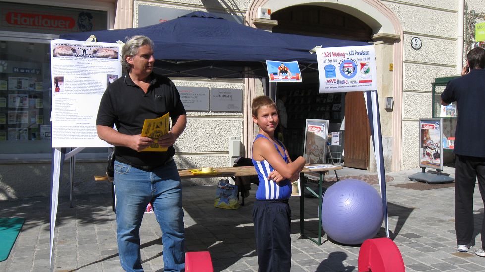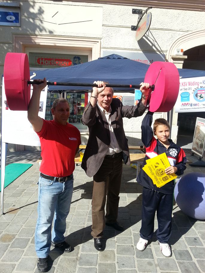 Die Europastadt Mödling zeigte Sportvereine und Sportler und diese präsentierten ihr Können beim Tag des Sports, die Trainings-Möglichkeiten in den Vereinen und die in den Vereinen angebotenen Serviceleistungen am Schrannen Platz vor dem Rathaus. Selbstverständlich war auch die 1. Kraftsportvereinigung Mödling mit einem Stand vertreten und konnte mit Plakaten, praktischen Vorführungen und kompetenter Auskunft die Interessenten begeistern. Es herrschte reger Andrang und Herr Bürgermeister, Landtagsabgeordneter Hans Stefan Hintner sowie diverse Stadträte mussten viele Hände schütteln. Unter anderem war auch die Innenministerin Fr. Dr. Mikl-Leitner anwesend und zeigte Interesse für den Sport. Herr Sportstadtrat MAYER konnte für ein Foto mit dem Obmann der 1. KSV-Mödling und seinem Sohn, welcher mittlerweile zu den besten Nachwuchsathleten (Schüler) in Österreich zählt, gewonnen werden.