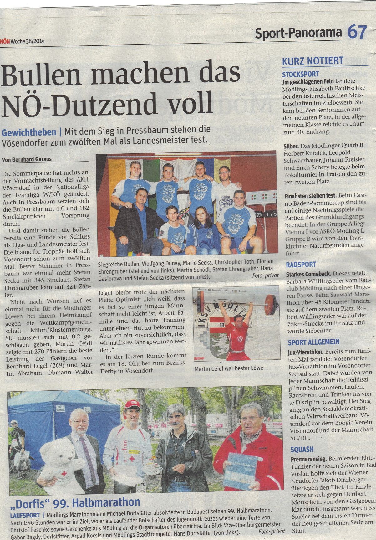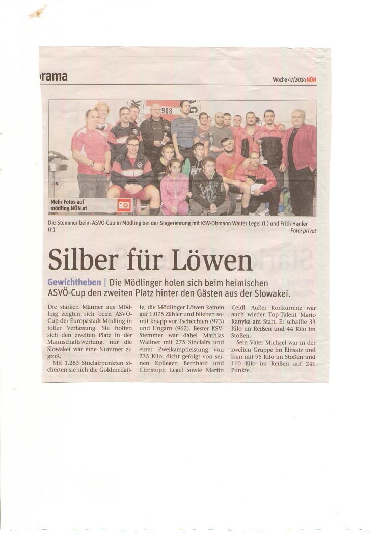 Am 18.10.2014 fand in Vösendorf die letzte Runde der Mannschaftsmeisterschaft statt, ohne viel Hoffnung auf einen Sieg gingen die Löwen an den Start. Die Löwen fochten jedoch einen internen Wettkampf um den besten Mödlinger aus, welchen Bernhard Legel knapp gewann, den Wettkampf aber verloren wir mit 6:0 (1560,94 Punkte---1314,35 Punkte) Tagesbester Bernhard Legel mit 278,65 Punkten. 2.ter Ceidl Martin mit 277,22 Punkten. Wallner Matthias 262,60 Punkten, ist wieder voll im Training. Legel Christoph 259,48 Punkten, konnte erstmals 98kg Reissen. Lenardt Matthias 236,40 Punkten