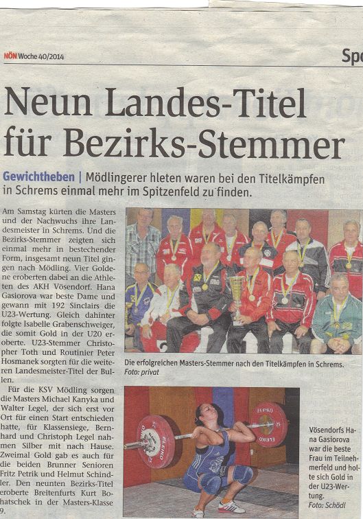 Drei Starter waren vom KSV-Mödling am Start bei den Masterstaatsmeisterschaften in Wels am 25.10.2014 dabei. Anton Burger mit 57kg Reissen und 80kg Stossen holte sich Gold. Legel Walter schaffte 75kg Reissen & 95kg Stossen, das reichte nur für Silber. Kanyka Michael auch Silber mit 90kg Reissen und 111kg Stossen. Jahresbestleistung!