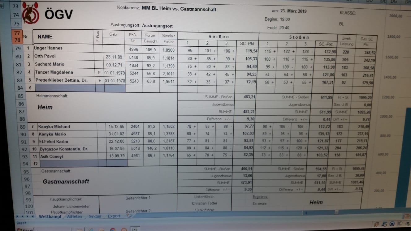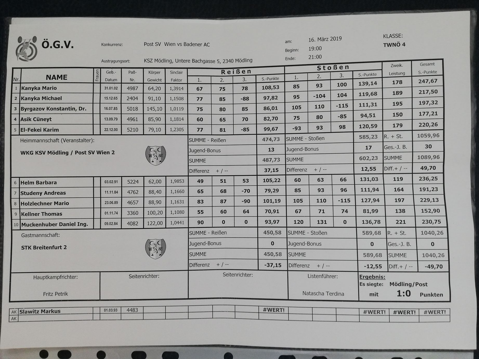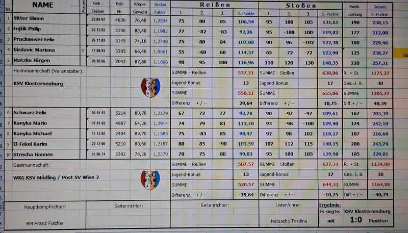 Am 04.10.2019 waren wir in Klosterneuburg, bei der letzten Mannschaftsmeisterschaft, zu Gast. Mario Kanyka war an diesem Tag nicht in Top-Form und erreichte 81kg im Reißen und 93 kg im Stoßen. Michael Kanyka konnte 85kg im Reißen und 102kg im Stoßen erreichen.